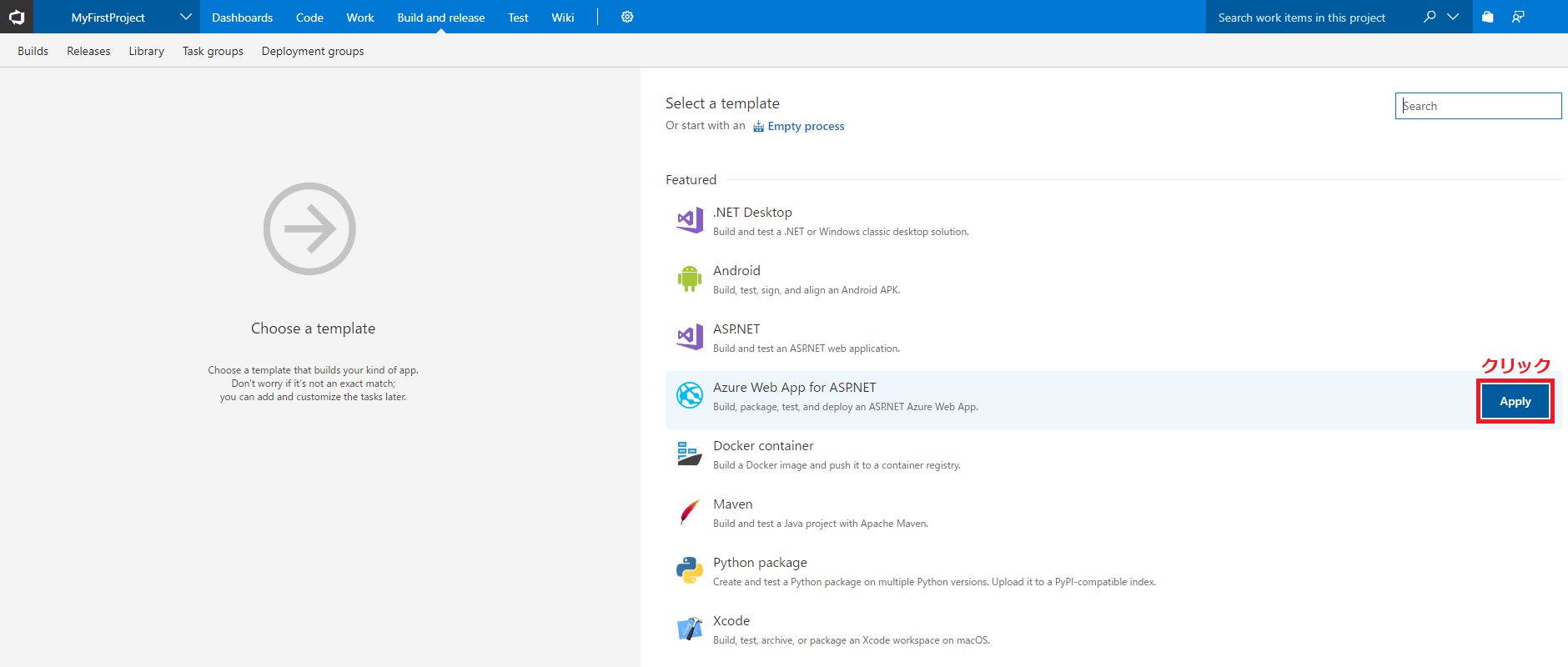 「Azure Web App for ASP.NET」を選択して「Apply」をクリックします。