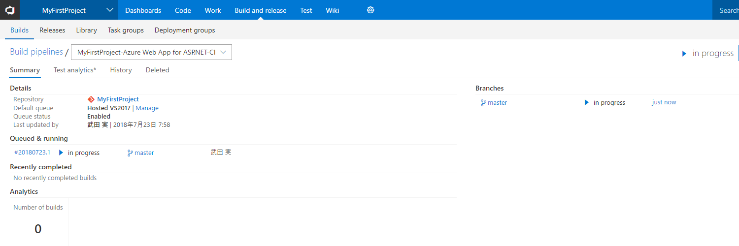 「Build pipeline」画面に「MyFirstProject-Azure Web App for ASP.NET-CI」の項目が追加されています、右側の「Status」が「in progress」になっているのを確認してクリックします。